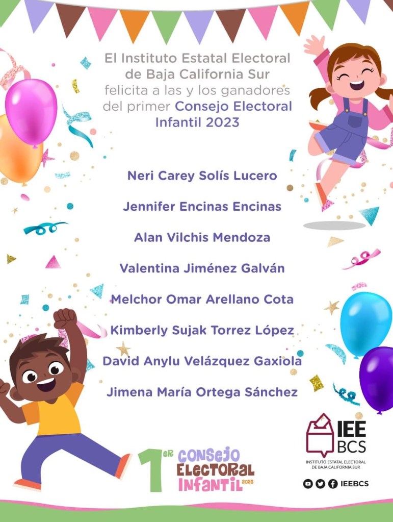 El pasado mes de septiembre, el Instituto Estatal Electoral de Baja California Sur publicó la convocatoria para invitar a niños residentes de La Paz, de 9 a 12 años, a participar en el primer Consejo Electoral Infantil 2023, a celebrarse este 17 de Octubre.