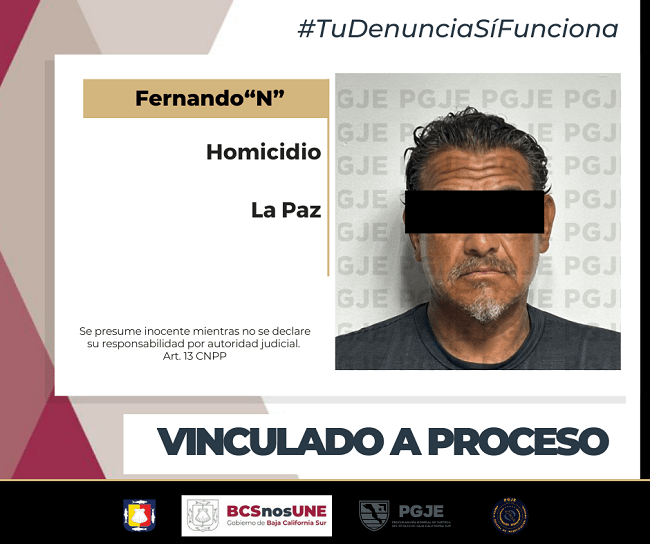 En la continuación de audiencia inicial por orden de aprehensión que se efectuó este domingo 8 del mes en curso en el Centro de Justicia Penal de La Paz, Fernando “N”, de apodo El gordo quedó formalmente vinculado a proceso y permanecerá en prisión el tiempo que dure dicho proceso, imputado por el delito de homicidio en agravio de quien en vida llevara el nombre de Jesús Elmer “N”.
