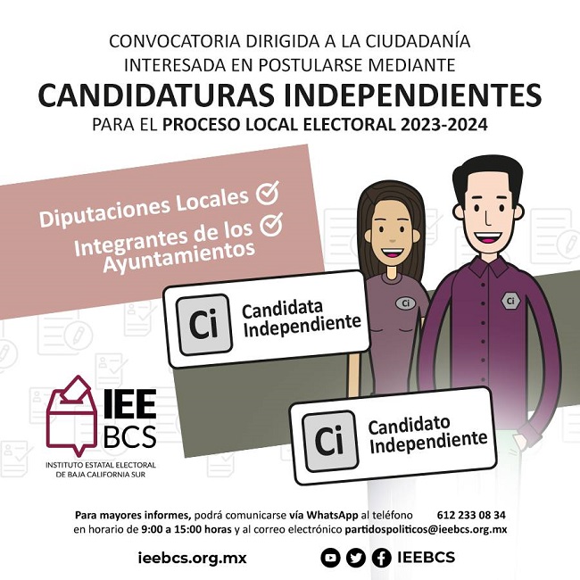 El Consejo General del Instituto Estatal Electoral de Baja California Sur, aprobó en sesión extraordinaria la convocatoria la emisión de la convocatoria dirigida a la ciudadanía interesada en postularse mediante candidaturas independientes a los cargos de diputaciones por el principio de mayoría relativa e integrantes de los ayuntamientos del estado de Baja California Sur, para el proceso local electoral 2023-2024.