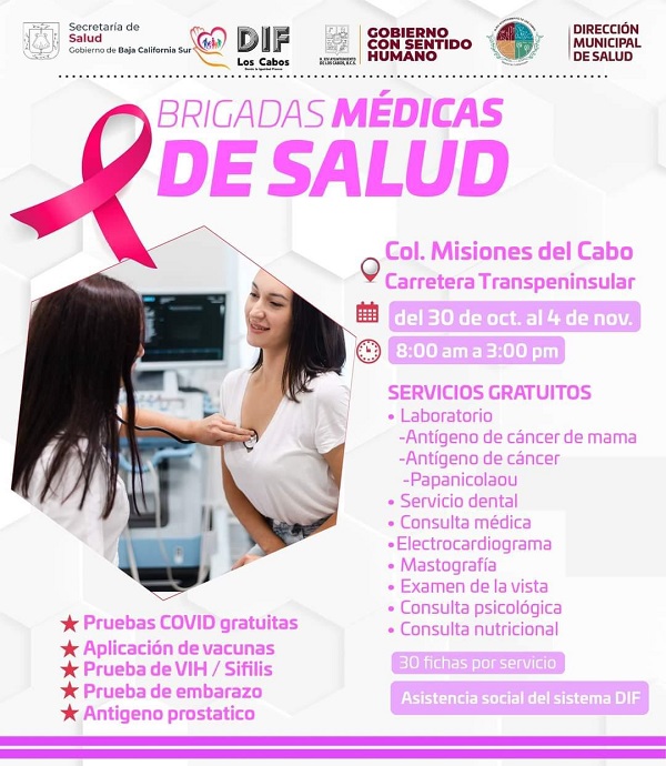 El titular de la Dirección Municipal de Salud en Los Cabos, Dr. Juan Carlos Costich Pérez, reiteró que la ciudadanía podrá acceder sin costo alguno a los siguientes servicios: pruebas de VIH y sífilis, pruebas de antígeno de cáncer de mama, antígeno de cáncer cervicouterino y antígeno prostático, aplicación de vacunas, estudios de laboratorio, servicio dental, consultas médicas, psicológicas y nutricionales, electrocardiograma, mastografía, papanicolaou, examen de la vista y pruebas de embarazo, así como pruebas de COVID-19; quienes asistan también contarán con la asistencia social del Sistema para el Desarrollo Integral de la Familia (DIF).