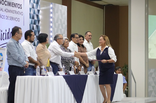 Durante el evento, que tuvo lugar en el Poliforo Cultural Universitario, las trabajadoras y trabajadores administrativos recibieron certificados de honor por 10, 15, 20, 25, 30, 35 y 40 años de servicio leal y comprometido con la UABCS, siendo testigos integrantes de la comunidad universitaria, familiares y amistades.