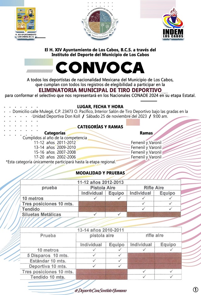 El Instituto del Deporte del Municipio de Los Cabos (INDEM), encabezado por Ricardo Manríquez Castillo, da a conocer que se encuentra abierta la convocatoria para conformar el selectivo que participará en la etapa estatal de los Juegos CONADE 2024, en la disciplina de tiro deportivo.
