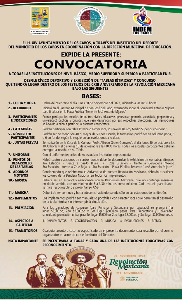 El XIV Ayuntamiento de Los Cabos que preside Oscar Leggs Castro, a través del Instituto del Deporte del Municipio de Los Cabos (INDEM), invita a las escuelas de los diferentes niveles educativos a participar en el desfile cívico deportivo, exhibición y concurso de tablas rítmicas que se efectuará este próximo lunes 20 de noviembre para celebrar el 113° aniversario de la Revolución Mexicana.