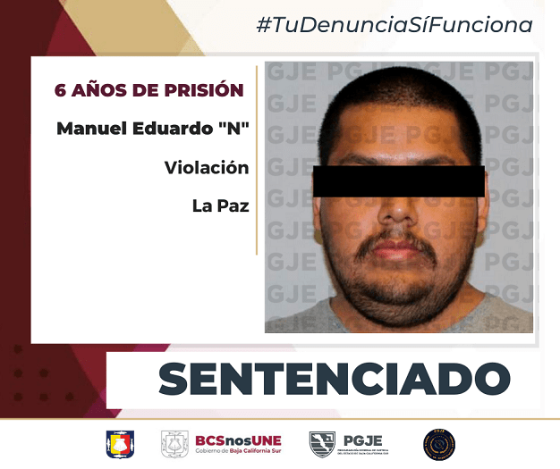 La Procuraduría General de Justicia del Estado (PGJE) de Baja California Sur demostró ante un Juez de Control la responsabilidad penal del acusado Manuel Eduardo “N”, por el delito de violación, en la audiencia efectuada el lunes 6 del mes en curso en el Centro de Justicia Penal, en la capital del estado.