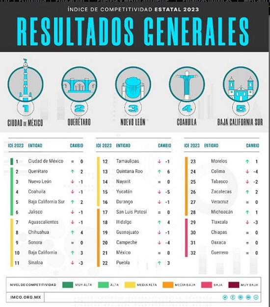 De acuerdo con una medición realizada por el Instituto Mexicano para la Competitividad (IMCO), Baja California Sur se encuentra dentro de los resultados generales del Índice de Competitividad Estatal 2023 (ICE), en el quinto puesto a nivel nacional.