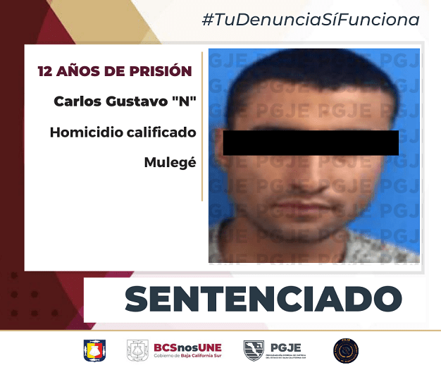 La Procuraduría General de Justicia del Estado (PGJE) de Baja California Sur obtuvo sentencia de 12 años 6 meses de prisión, contra culpable de homicidio calificado, en audiencia de procedimiento abreviado en donde los datos de prueba que presentó, fueron suficientes para que Carlos Gustavo “N”, aceptara su participación en el ilícito.