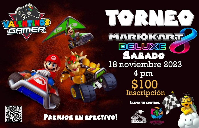 Como parte de las actividades en el fomento a una convivencia sana de la niñas, niños y jóvenes en Los Cabos, el Instituto de la Juventud (INJUVE) en colaboración con la empresa Valentino’s Gamer en San José del Cabo, invitan al Torneo de Mario Kart Deluxe este sábado 18 de noviembre a las 04:00 de la tarde, la inscripción tiene un costo de recuperación de $100 pesos y la posibilidad de llevarse premios en efectivo.