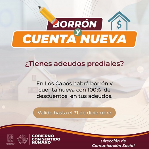 Como parte de las acciones encaminadas a cerrar el ejercicio fiscal 2023 con números favorables en recaudación, el Gobierno de Los Cabos a través de la Tesorería General Municipal, invita a la población que tenga recargos de hasta 5 años en el pago de su predial, a ponerse al corriente y obtener el 100% de descuentos a través de la Campaña Borrón y Cuenta Nueva, así lo dio a conocer el tesorero general Cristopher Albertini Camacho Ortegón.
