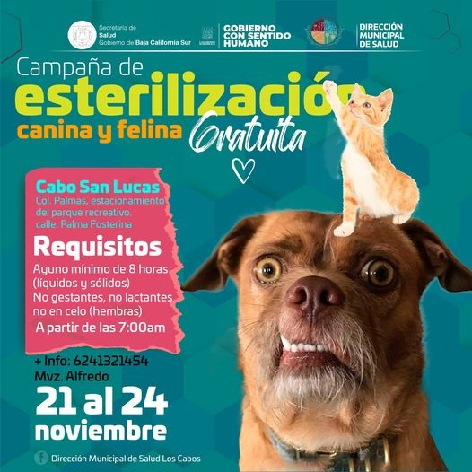 Será el próximo viernes 24 de noviembre cuando concluya la Campaña de esterilización canina y felina que instaló personal de la Dirección Municipal de Salud del XIV Ayuntamiento de Los Cabos que preside Oscar Leggs Castro, con el objetivo de crear consciencia y apoyar a la ciudadanía.