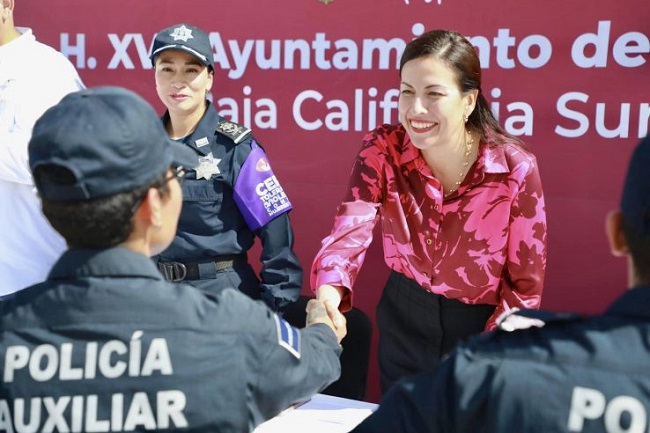 Con una inversión de 7 millones 678 mil 761 pesos de recursos propios, la Presidenta Municipal acompañada por la Teniente Ruth de la Fuente Velázquez, titular de la Dirección General de Seguridad Pública, Policía Preventiva y Transito de La Paz, y el Secretario Técnico de la Secretaría de Seguridad y Protección Ciudadana, Francisco Javier Ramírez Robles, otorgaron 2,200 uniformes con pantalón y camisola tácticos, mil juegos de short y playera deportivos, 1,100 pares de botas tácticas y 1,100 gorras.