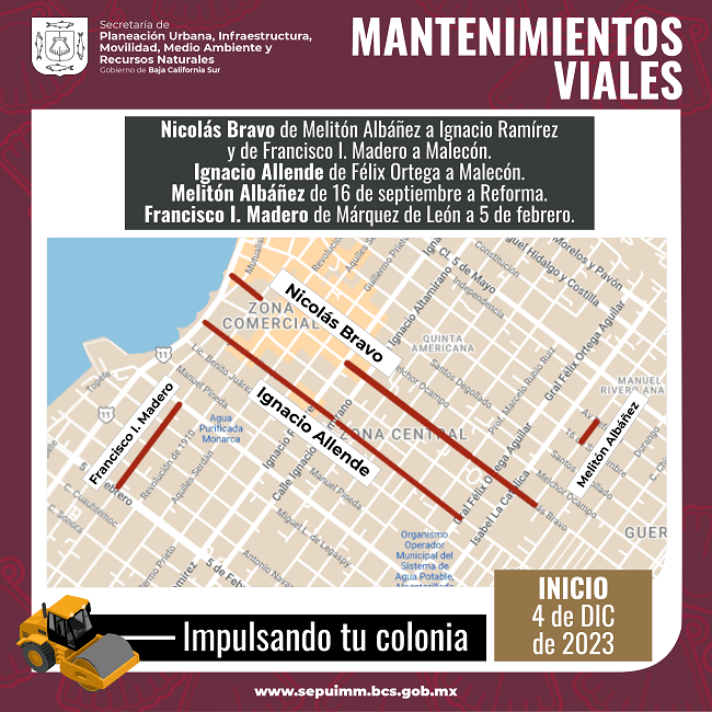 El Gobierno del Estado, a través de la Secretaría de Planeación Urbana, Infraestructura, Movilidad, Medio Ambiente y Recursos Naturales (SEPUIMM), informa que, con el objetivo de mejorar las condiciones en vialidades, a partir de este lunes 4 de diciembre se iniciará con trabajos de mantenimiento.