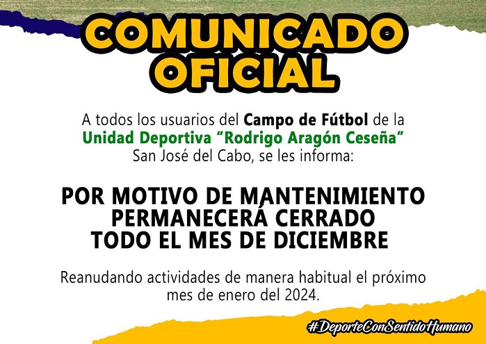 El Gobierno Municipal que preside Oscar Leggs Castro, a través del Instituto del Deporte del Municipio de Los Cabos encabezado por Ricardo Manríquez Castillo, informa que a partir de este jueves 07 de diciembre la unidad deportiva “Rodrigo Aragón Ceseña”, en San José del Cabo, permanecerá cerrada al público.