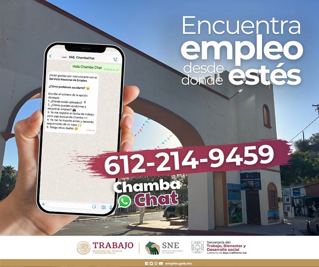 A un mes de entrar en operación “ChambaChat”, la nueva alternativa de atención en materia laboral vía whatsapp implementada por el Servicio Nacional de Empleo de Baja California Sur (SNE-BCS) ha logrado atender a más de 480 buscadores de empleo, informó Vladimir Torres Navarro, director general del SNE-BCS.