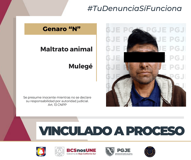 La Procuraduría General de Justicia del Estado (PGJE) de Baja California Sur obtuvo auto de vinculación a proceso contra Genaro «N» por su probable responsabilidad en el delito de maltrato de animal doméstico utilizando métodos de extrema crueldad, ocurrido el 15 de octubre de 2021, en el ejido de San Lucas en el municipio de Mulegé.