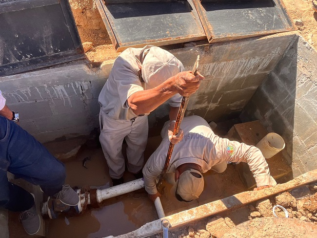 Cumpliendo el compromiso del OOMSAPAS Los Cabos de asegurar el suministro del vital líquido a las colonias que se encuentran en el tandeo, el equipo de la Coordinación de Operación y Mantenimiento realizó el cambio de una válvula de compuerta del troncal que suministra de agua potable a los condominios Lomas del Valle Plus, lo que permitió dotar de agua potable a las familias del sector.
