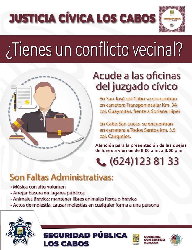 Con el propósito de auxiliar a la ciudadanía, así como de prevenir delitos y faltas administrativas, el XIV Ayuntamiento de Los Cabos que dirige el alcalde Oscar Leggs Castro, pone a disposición de la ciudadanía el área de Justicia Cívica, para dar solución a las diversas quejas o conflictos que se puedan presentar entre vecinos.