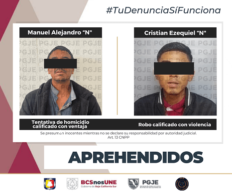 Por los delitos de homicidio con ventaja en grado de tentativa acabada y robo con violencia moral portando arma en establecimiento comercial abierto al público, dos hombres fueron asegurados por elementos de la Procuraduría General de Justicia del Estado (PGJE) de Baja California Sur, en cumplimiento a diversas órdenes de aprehensión.