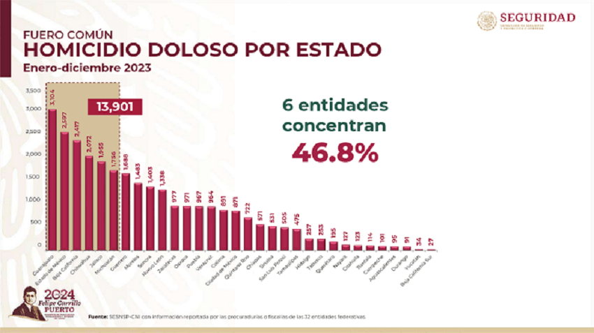 Hoy por hoy, Baja California Sur se sitúa en un puesto muy lejano a lo que ocurre en entidades como Guanajuato, Edomex, BC, Chihuahua, Jalisco o Michoacán, entidades que concentran más del 46% de los homicidios dolosos en el país con 13901 en el 2023. Los resultados del último levantamiento de la Ensu (Encuesta de seguridad) publicada por el INEGI, colocan a la entidad en el último lugar en homicidios dolosos con apenas 27 en el periodo de enero a diciembre del 2023.