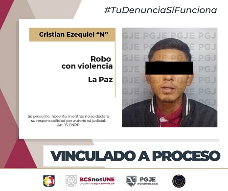 En la continuación de audiencia inicial por orden de aprehensión, efectuada el domingo 21 del mes en curso, la Procuraduría General de Justicia del Estado (PGJE) de Baja California Sur, obtuvo prisión preventiva justificada para imputado por el delito de robo en establecimiento comercial abierto al público con violencia por persona armada.