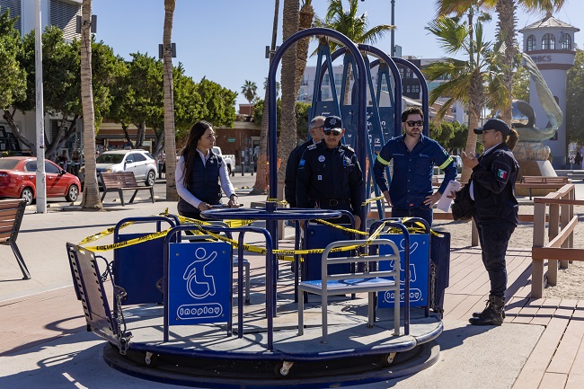El director general de la Administración Portuaria Integral de Baja California Sur (API-BCS), Narciso Agúndez Gómez, se reunió con la directora de Seguridad Pública, Policía Preventiva y Tránsito del Municipio de La Paz, Teniente de Navío Rut de la Fuente Velázquez y elementos de la Policía Turística, para atender las medidas de seguridad en el área de esparcimiento infantil para niñas y niños con discapacidad en el malecón costero, luego de presentarse diversos accidentes a causa del mal uso realizado, para ello, se estableció al acordonamiento de esta zona inclusiva en tanto se aplicaban medidas adicionales de seguridad.