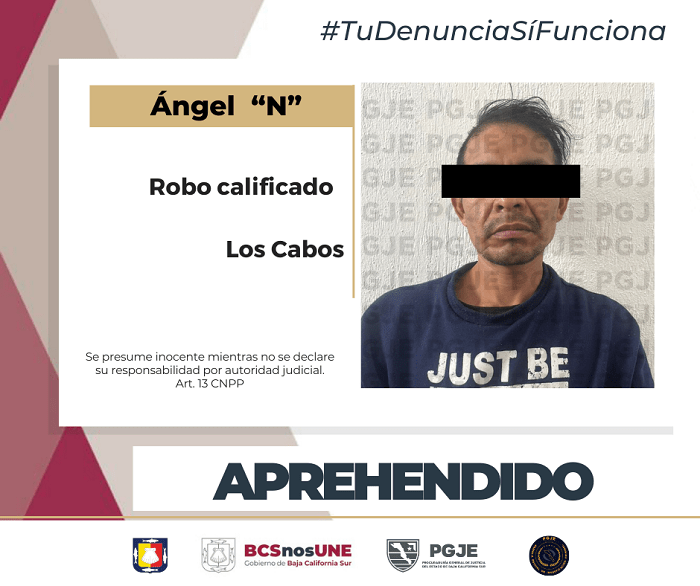 La mañana del lunes 5 de febrero en la colonia Guaymitas, de San José del Cabo, elementos de la Unidad de Investigación de Mandamientos Judiciales, cumplimentaron orden de aprehensión en contra de Ángel “N” de 34 años, probablemente relacionado con el delito de robo calificado cometido por 2 personas, esa cabecera municipal.