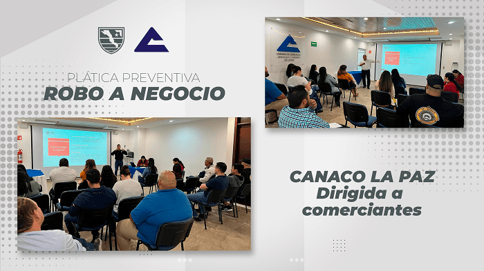 La importancia de la denuncia y cómo se conduce una investigación, así como, protocolos de actuación antes, durante y después del ilícito, fueron algunos de los temas abordados este miércoles 7 de febrero por personal de la Procuraduría General de Justicia del Estado (PGJE), y empresarios agremiados a la Cámara de Comercio, Servicios y Turismo de La Paz, (CANACO).