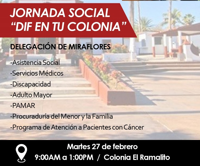Con el firme propósito de seguir consolidando la atención cercana y directa a la ciudadanía, el Sistema Municipal DIF Los Cabos realizará este próximo 27 de febrero en Miraflores la jornada de asistencia social “DIF en tu colonia”.