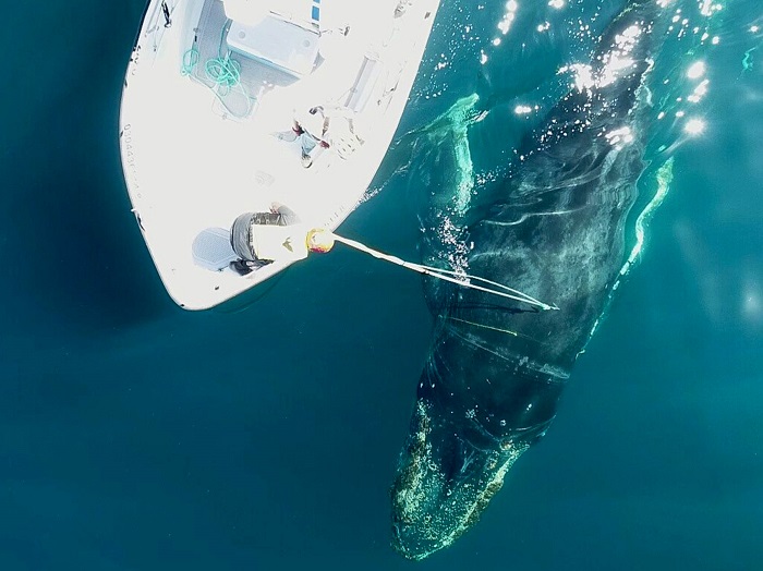 Debido a la naturaleza del enmalle, dijo que en esta ocasión fue imprescindible comenzar el proceso de la parte frontal hacia atrás, marcando en principio a la ballena con la ayuda del grampín, boyas y una línea.