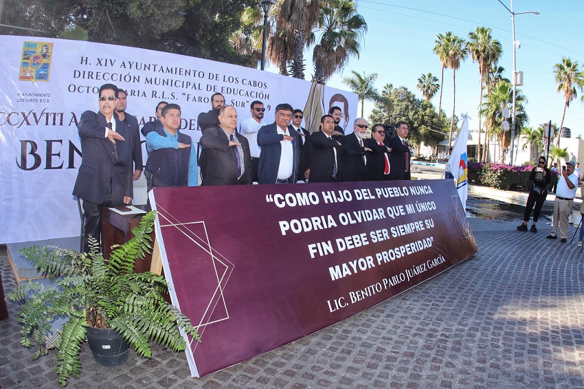 El Gobierno de Los Cabos a través de la Dirección Municipal de Educación, en colaboración con la Octogenaria Respetable Logia Simbólica Faro del Sur Número 09, realizó la conmemoración por el 218º aniversario del natalicio del licenciado Benito Pablo Juárez García con un acto cívico de honores a los lábaros patrios desde la rotonda con su busto en el centro histórico de San José del Cabo.