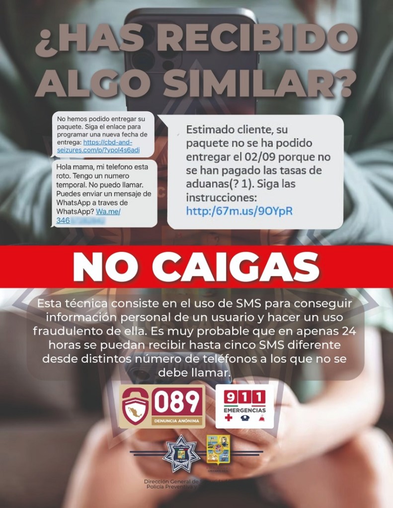 De manera frecuente se ha implementado una nueva forma de robo de información, este método delictivo se llama “Smishing”, que es un tipo de delito o actividad criminal con base en técnicas de ingeniería social con mensajes de texto dirigidos a las personas usuarias de telefonía móvil para engañarlas y que descarguen malware, compartan información confidencial o envíen dinero a delincuentes cibernéticos.