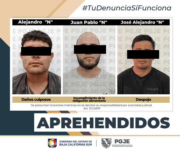 La Procuraduría General de Justicia del Estado (PGJE) de Baja California Sur informa sobre las recientes acciones llevadas a cabo por agentes de investigación en distintas localidades del estado, que resultaron en la aprehensión de tres individuos por diversos delitos.