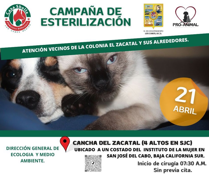 Por último, el día 21 de abril en conjunto con la A.C. de Casa Sheila se realizará una jornada en la cancha de la colonia El Zacatal en el conocido 4 altos, ubicado a un costado del Instituto Municipal de la Mujer en San José del Cabo; en esta fecha no es necesario realizar cita previamente, únicamente se le solicita acudir a partir de las 7:00 de la mañana.