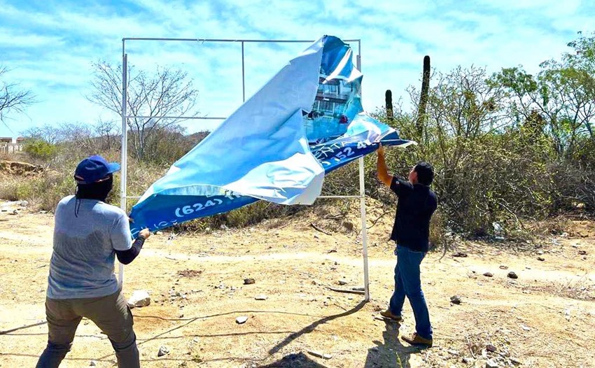 Entre otros de los trabajos que se implementan cotidianamente en la Coordinación de Imagen Urbana en Cabo San Lucas, se encuentra el retiro de pendones, carteles y volantes en postes, al igual que el ordenamiento de las estructuras publicitarias para que no superen los límites establecidos en el municipio de Los Cabos.