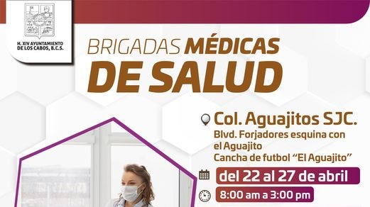 La Dirección Municipal de Salud informa que las unidades de las Brigadas Médicas continuarán ofreciendo los servicios en la cancha de futbol de la colonia Aguajitos en San José del Cabo del 22 al 27 de abril, con el objetivo de brindar atención primaria, diagnosticar enfermedades comunes y proporcionar recomendaciones de salud.