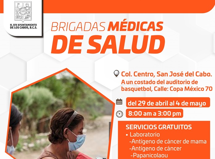 A partir de este lunes 29 de abril y hasta el 04 de mayo, las Brigadas Médicas se ubicarán en la colonia Centro en San José del Cabo a un costado del Auditorio de Básquetbol, sobre la calle Copa México 70; por lo que se invita a la ciudadanía a aprovechar los diversos servicios de salud.