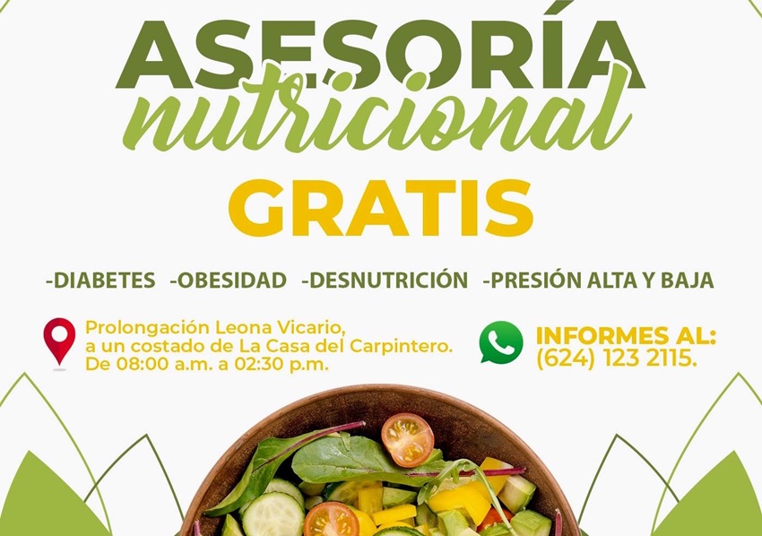Las personas con interés en recibir las asesorías nutricionales pueden acudir al consultorio que se localiza en la avenida Prolongación Leona Vicario, como mayor referencia a un costado de La Casa del Carpintero, de 08:00 de la mañana a 02:30 de la tarde, para mayores informes pueden comunicarse al (624)123-2115.