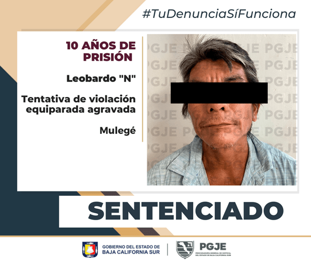 La Procuraduría General de Justicia del Estado (PGJE) de Baja California Sur, obtuvo sentencia condenatoria de 10 años de prisión para Leobardo “N” de 52 años, por el delito de violación equiparada agravada en grado de tentativa acabada en agravio de una mujer.