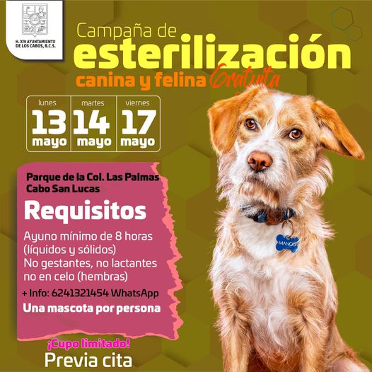 Lunes 13, martes 14 y viernes 17 de mayo estaremos esterilizando a perritos y gatos en el parque de la col. Las palmas en Cabo San Lucas.