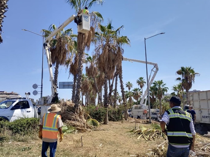 El personal de la Dirección General de Servicios Públicos Municipales, a través de la Coordinación de Parques y Jardines, en colaboración con elementos de la Comisión Federal de Electricidad, llevó a cabo labores de limpieza y poda de palmeras que bordean la carretera Transpeninsular, específicamente en San José del Cabo.