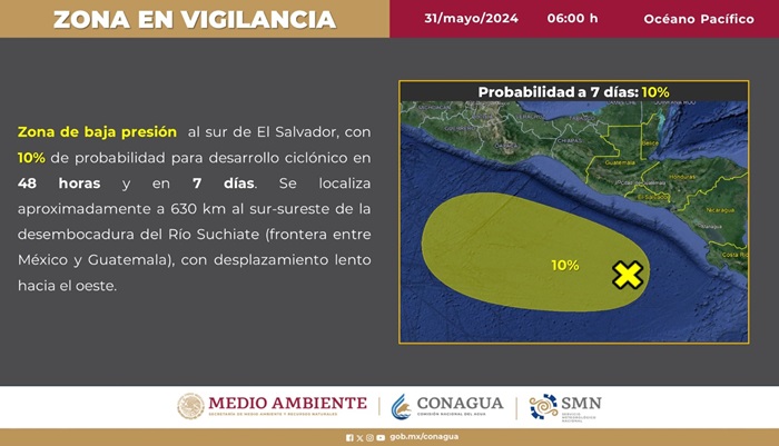 De acuerdo al boletín emitido por el Servicio Meteorológico Nacional y la Comisión Nacional del Agua, se espera que este sistema evolucione lentamente en el transcurso del fin de semana y principios de la próxima semana, mientras se desplaza lento hacia el oeste, sobre el sur de las costas de México.