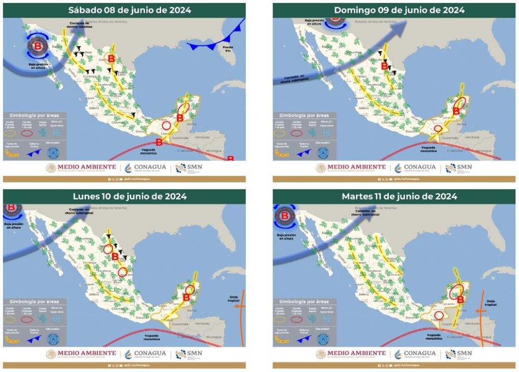 En el transcurso del fin de semana, se prevé la presencia de vientos fuertes con rachas de 40 a 70 km/h con probabilidad de tolvaneras sobre nuestra península de Baja California Sur, esto derivado a la interacción de Canales de Baja Presión y una Baja Presión en Altura, además de divergencia en altura.
