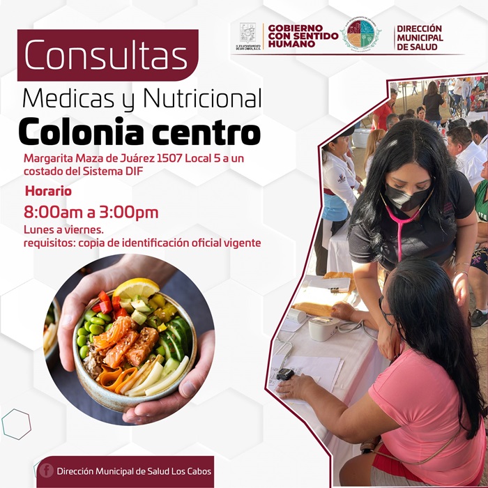 Con el objetivo de acercar los servicios médicos y atender de manera gratuita a la ciudadanía del municipio, la Dirección Municipal de Salud de Los Cabos, invita a la población que lo requiera a que asista al consultorio que se ubica en Margarita Maza de Juárez 1507 a un costado del sistema DIF en SJC; de lunes a viernes ambos con un horario de atención de 8:00 de la mañana a 3:00 de la tarde.