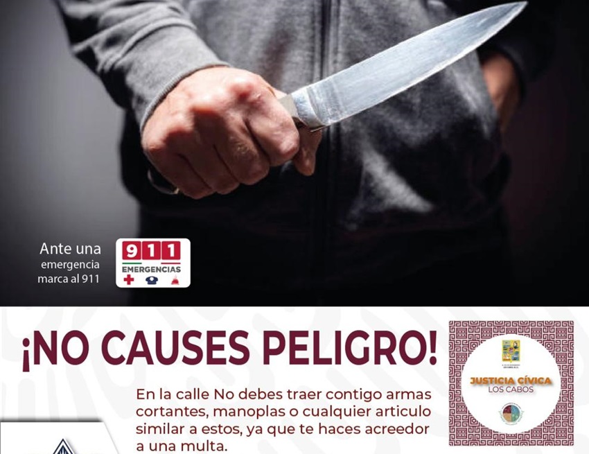 La Dirección General de Seguridad Pública, Policía Preventiva y Tránsito Municipal (DGSPPPTM) informó que, la sanción por portar armas blancas en la vía pública, en Los Cabos, asciende a 200 Unidades de Medida y Actualización (UMA), es decir, a más de 21,000 pesos. Las personas también podrían ser arrestadas hasta por 36 horas.