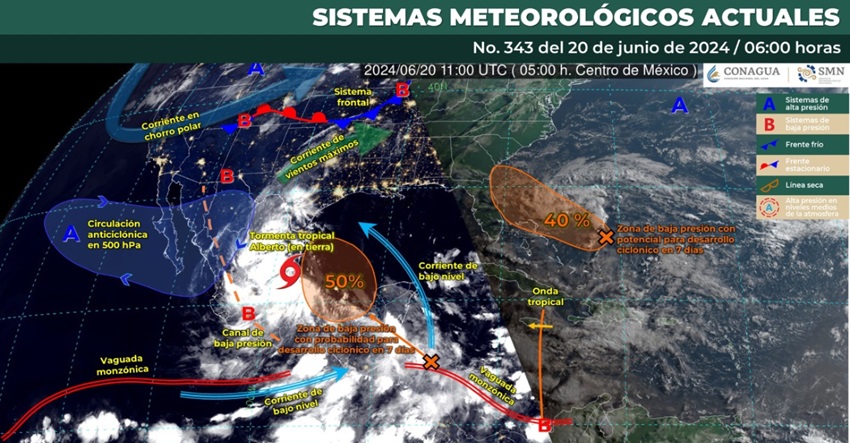 El boletín de la Comisión Nacional del Agua (CONAGUA), informa que la depresión tropical ‘’Alberto’’ continúa su desplazamiento en tierra sobre el territorio nacional, a las 12:00 horas, tiempo del centro de México, su centro se localizó aproximadamente a 50 kilómetros (km) al este-noreste de San Luis Potosí, San Luis Potosí, y a 170 km al oeste-suroeste de Ciudad Mante, Tamaulipas, con vientos máximos sostenidos de 55 kilómetros por hora (km/h), rachas de 75 km/h y desplazamiento hacia el oeste a 30 km/h.