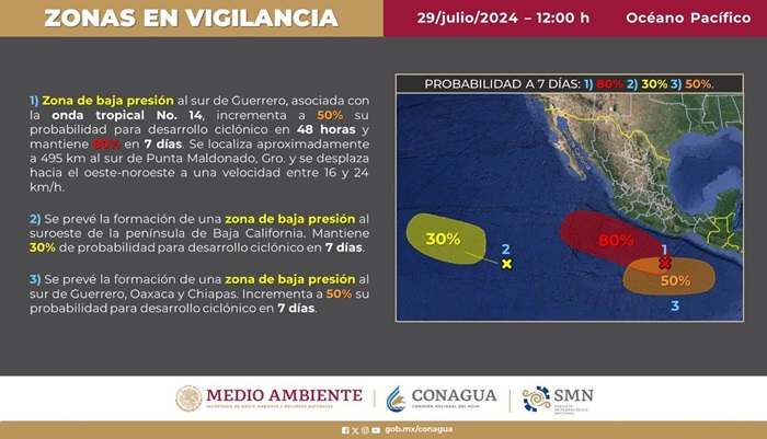 La Dirección Municipal de Protección Civil informa a la ciudadanía sobre la situación actual de dos zonas de baja presión en el Océano Pacífico, de acuerdo con el Servicio Meteorológico Nacional y la Comisión Nacional del Agua (CONAGUA), actualmente, la zona de baja presión asociada a la Onda Tropical No. 14 mantiene un 80% de probabilidad para desarrollo ciclónico en los próximos 7 días; se localiza a 495 km al sur de Punta Maldonado, Guerrero, y se desplaza al oeste-noroeste a una velocidad de entre 16 y 24 km/h.