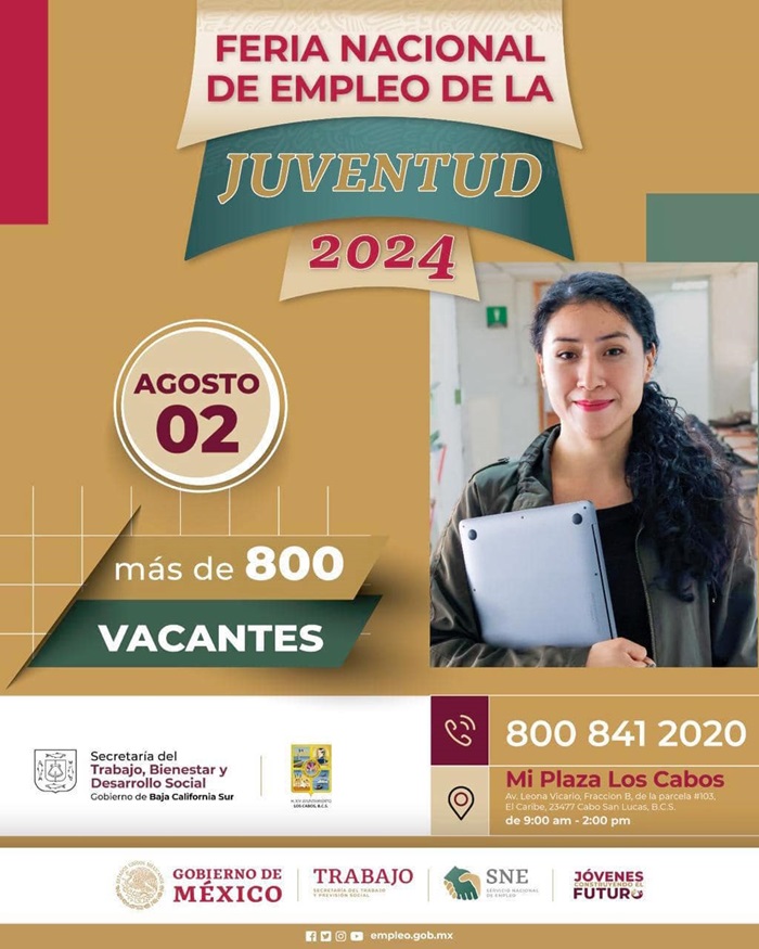 El Instituto de la Juventud del Municipio de Los Cabos (INJUVE) en colaboración con el Servicio Nacional de Empleo en Baja California Sur, realizarán la “Feria Nacional de Empleo de la Juventud 2024”, este viernes 2 de agosto al interior del centro comercial “Mi Plaza” que se localiza en Cabo San Lucas a la altura de la colonia El Caribe, a partir de las 09:00 de la mañana y hasta las 02:00 de la tarde, ofreciendo más de 800 vacantes a través de 40 empresas de hotelería, construcción, supermercados y tiendas departamentales, por mencionar algunas.
