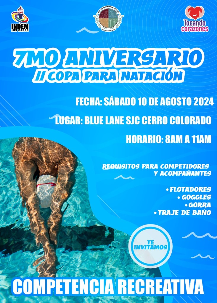Para conmemorar el 7mo aniversario del programa Tocando Corazones encabezado por la maestra Alicia Romero Geraldo, el Gobierno de Los Cabos a través del Instituto del Deporte (INDEM), en coordinación con el Instituto Municipal para el Desarrollo e Inclusión de Personas con Discapacidad (IMDIS), invita a participar en la “2da Copa de Para-Natación” que se llevará a cabo este sábado 10 de agosto.