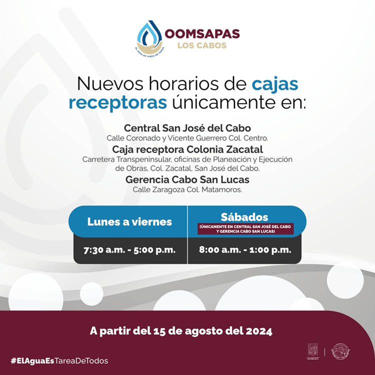 “Los puntos donde se aplicará este nuevo horario serán en las oficinas centrales en San José del Cabo, ubicadas en calle Coronado y Vicente Guerrero, colonia Centro; en la caja receptora de la Dirección de Planeación y Ejecución de Obras, ubicada sobre la carretera Transpeninsular, Col. Zacatal, San José del Cabo, y en las cajas de la Gerencia de Cabo San Lucas, ubicada en calle Zaragoza, Col. Matamoros, de lunes a viernes de 7:30 de la mañana a 5:00 de la tarde, y únicamente los días sábados de 8:00 de la mañana a 1:00 de la tarde en las oficinas centrales de San José del Cabo y en la Gerencia de Cabo San Lucas”, precisó el coordinador de Recursos Financieros de OOMSAPAS.