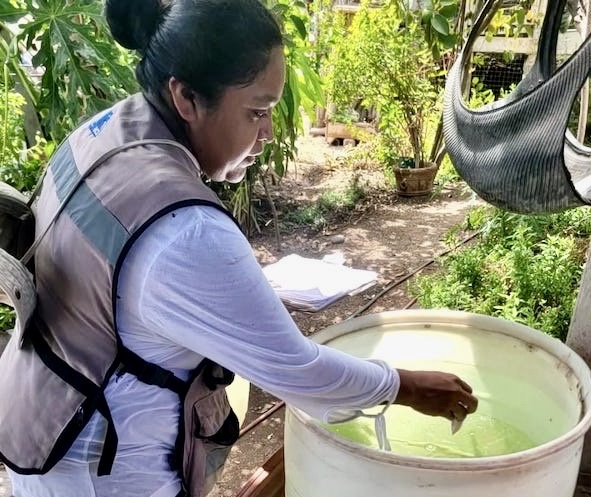 Como parte de este operativo, las y los brigadistas aplican larvicida en los depósitos utilizados en los domicilios para almacenar agua de uso diario, pero además sensibilizan a las y los vecinos para que contribuyan con el saneamiento básico de patios y viviendas, ya que con esto se evita que los cacharros sirvan de criaderos artificiales para los zancudos.