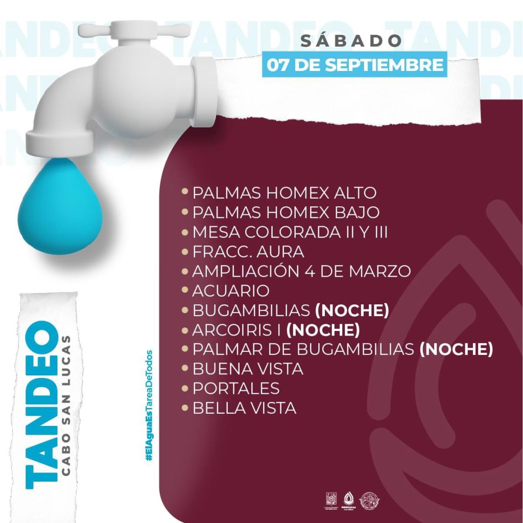 El Organismo de Agua Potable de Los Cabos da. Conocer el tandeo para el día de hoy 7 de septiembre.